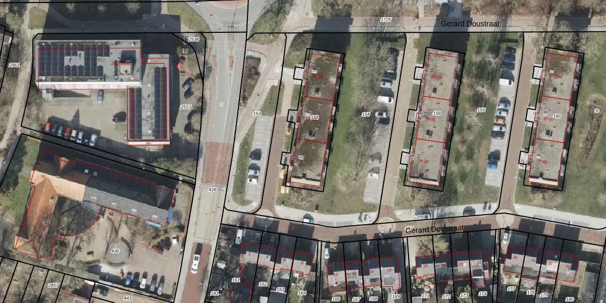 Het perceel waarop Gerard Doustraat 7 staat heeft een oppervlakte van 617 m². Dit is een groot perceel. De perceeloppervlakte wordt geregistreerd door het Kadaster. Gedetailleerde informatie over de maten van dit perceel kunt u vinden in het rapport Kadastrale kaart met maatvoering van Gerard Doustraat 7.
