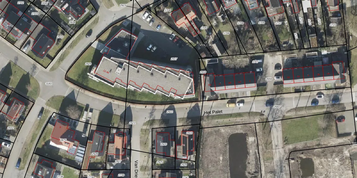 Het perceel waarop Het Palet 22 staat heeft een oppervlakte van 1740 m². Dit is een zeer groot perceel. De perceeloppervlakte wordt geregistreerd door het Kadaster. Gedetailleerde informatie over de maten van dit perceel kunt u vinden in het rapport Kadastrale kaart met maatvoering van Het Palet 22.