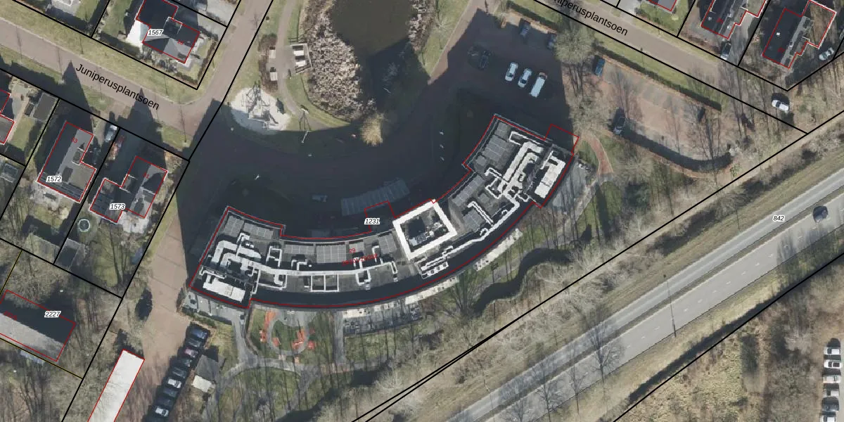 Het perceel waarop Juniperusplantsoen 29-118 staat heeft een oppervlakte van 1,3 ha. Dit is een zeer groot perceel. De perceeloppervlakte wordt geregistreerd door het Kadaster. Gedetailleerde informatie over de maten van dit perceel kunt u vinden in het rapport Kadastrale kaart met maatvoering van Juniperusplantsoen 29-118.