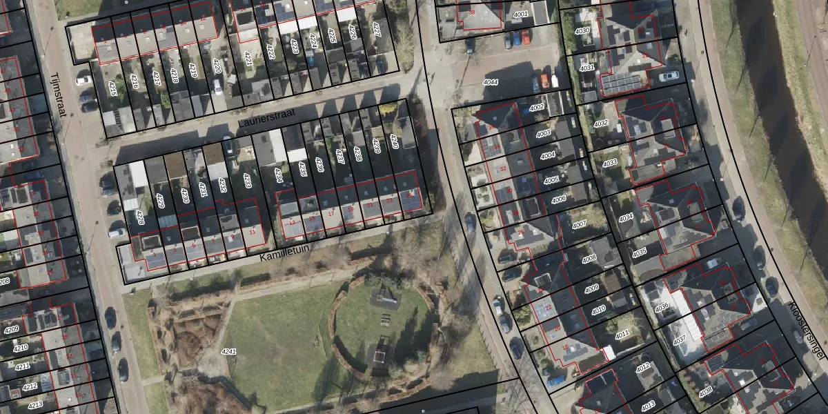 Het perceel waarop Kamilletuin 25 staat heeft een oppervlakte van 200 m². Dit is een middelgroot perceel. De perceeloppervlakte wordt geregistreerd door het Kadaster. Gedetailleerde informatie over de maten van dit perceel kunt u vinden in het rapport Kadastrale kaart met maatvoering van Kamilletuin 25.