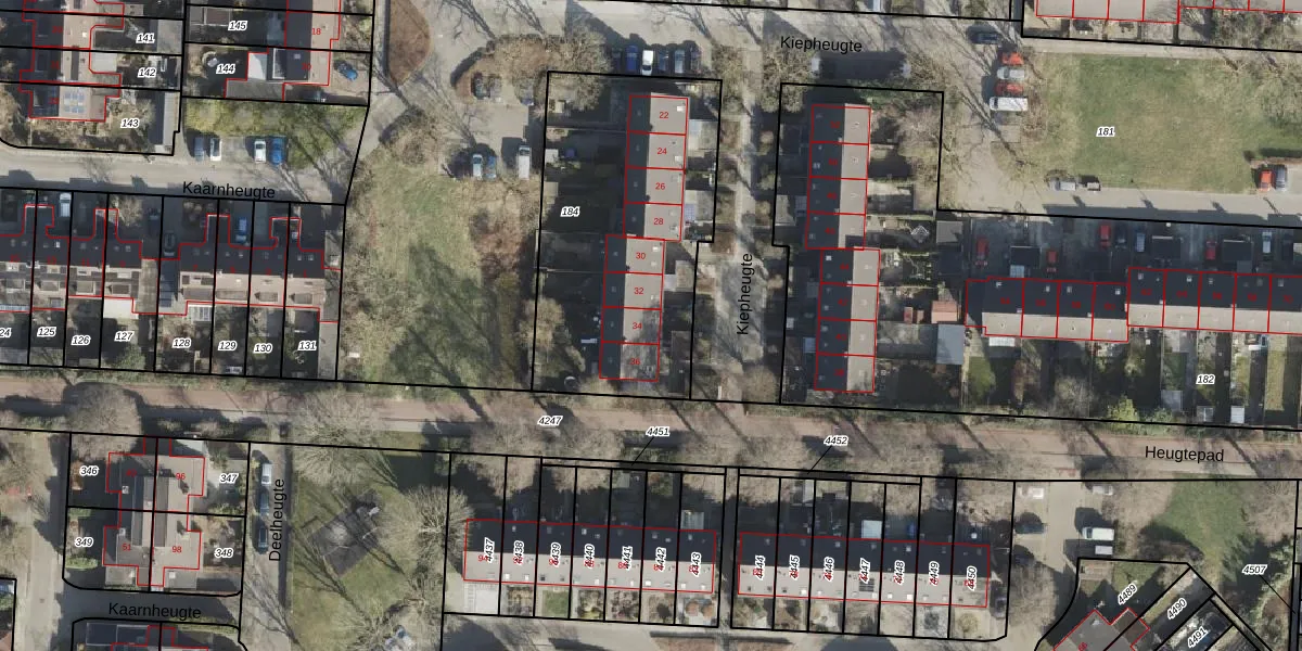 Het perceel waarop Kiepheugte 34 staat heeft een oppervlakte van 1263 m². Dit is een zeer groot perceel. De perceeloppervlakte wordt geregistreerd door het Kadaster. Gedetailleerde informatie over de maten van dit perceel kunt u vinden in het rapport Kadastrale kaart met maatvoering van Kiepheugte 34.