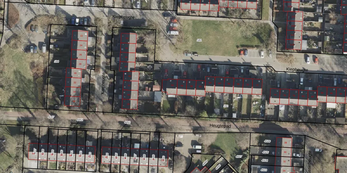 Het perceel waarop Kiepheugte 54 staat heeft een oppervlakte van 4760 m². Dit is een zeer groot perceel. De perceeloppervlakte wordt geregistreerd door het Kadaster. Gedetailleerde informatie over de maten van dit perceel kunt u vinden in het rapport Kadastrale kaart met maatvoering van Kiepheugte 54.