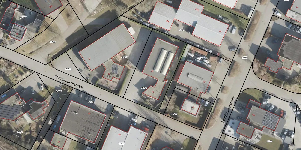 Het perceel waarop Klompmakerstraat 23 staat heeft een oppervlakte van 1250 m². Dit is een zeer groot perceel. De perceeloppervlakte wordt geregistreerd door het Kadaster. Gedetailleerde informatie over de maten van dit perceel kunt u vinden in het rapport Kadastrale kaart met maatvoering van Klompmakerstraat 23.