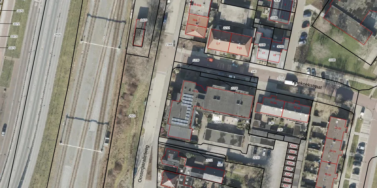 Het perceel waarop Koekoekstraat 34 staat heeft een oppervlakte van 1740 m². Dit is een zeer groot perceel. De perceeloppervlakte wordt geregistreerd door het Kadaster. Gedetailleerde informatie over de maten van dit perceel kunt u vinden in het rapport Kadastrale kaart met maatvoering van Koekoekstraat 34.
