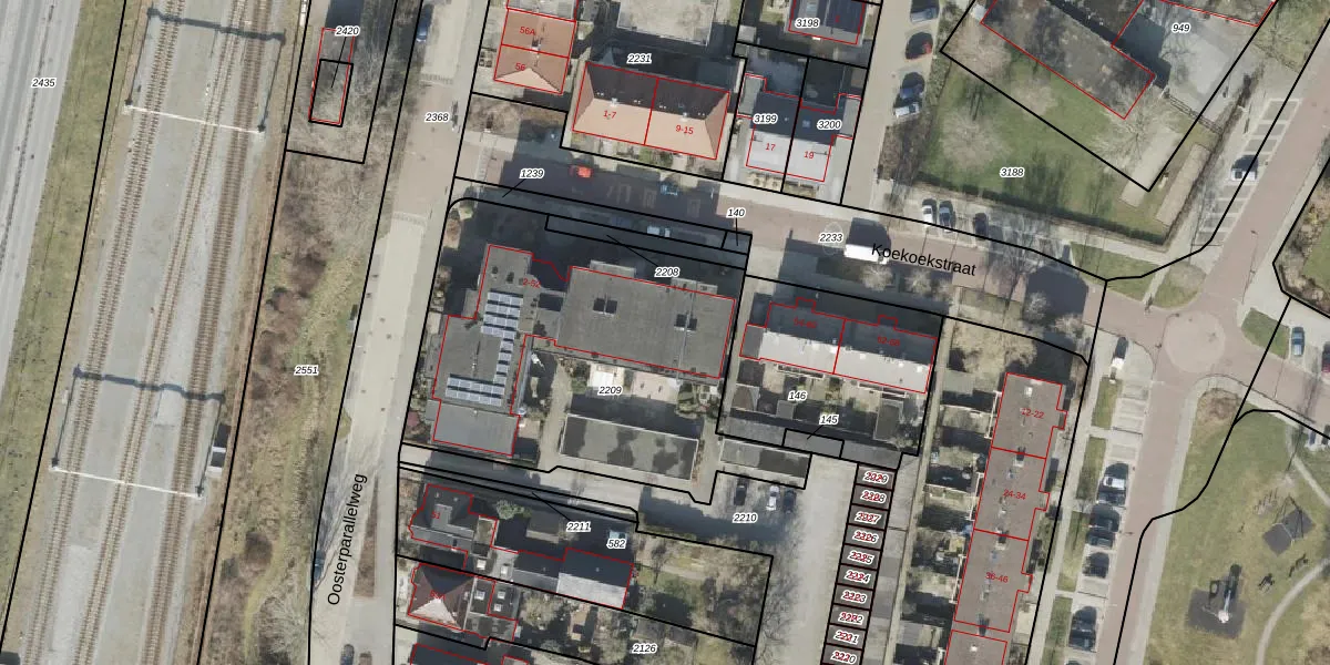 Het perceel waarop Koekoekstraat 46 staat heeft een oppervlakte van 1740 m². Dit is een zeer groot perceel. De perceeloppervlakte wordt geregistreerd door het Kadaster. Gedetailleerde informatie over de maten van dit perceel kunt u vinden in het rapport Kadastrale kaart met maatvoering van Koekoekstraat 46.