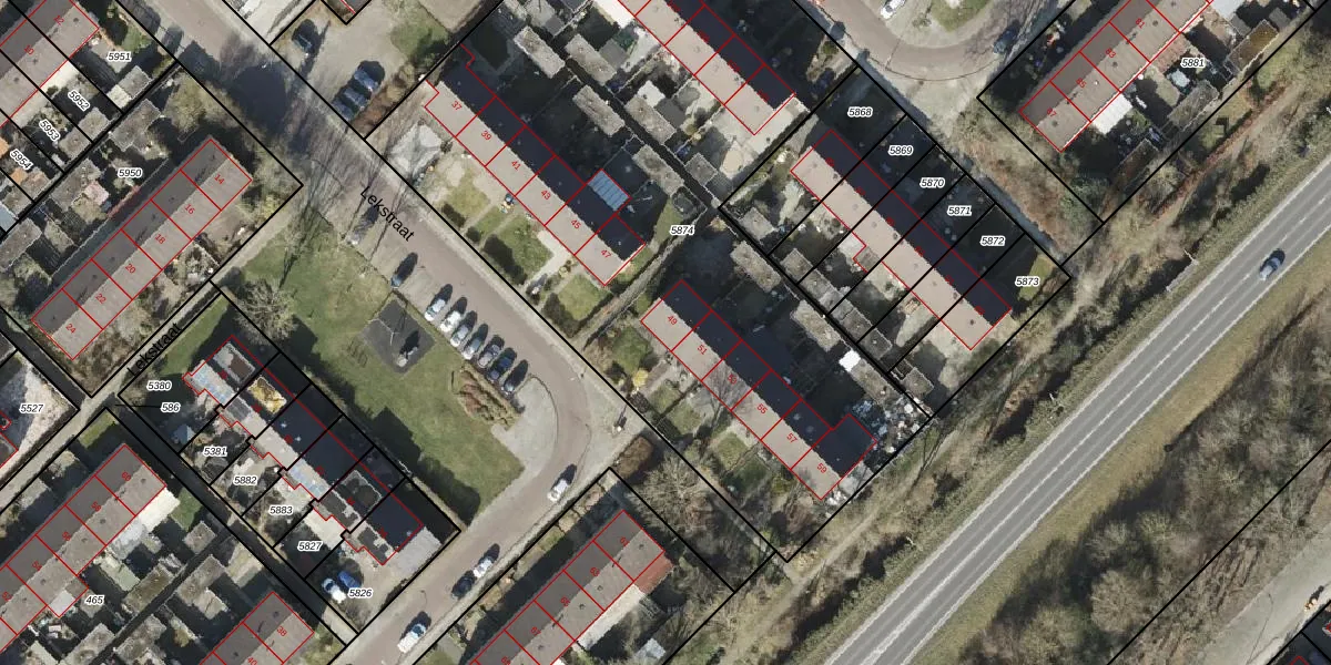 Het perceel waarop Lekstraat 49 staat heeft een oppervlakte van 4090 m². Dit is een zeer groot perceel. De perceeloppervlakte wordt geregistreerd door het Kadaster. Gedetailleerde informatie over de maten van dit perceel kunt u vinden in het rapport Kadastrale kaart met maatvoering van Lekstraat 49.