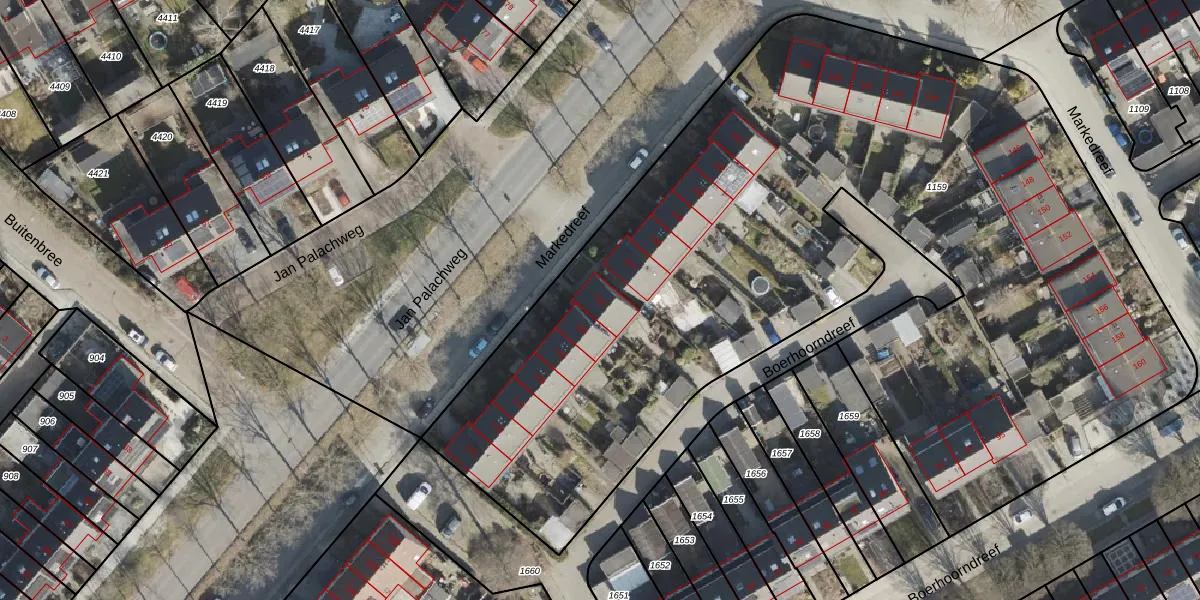 Het perceel waarop Markedreef 122 staat heeft een oppervlakte van 5875 m². Dit is een zeer groot perceel. De perceeloppervlakte wordt geregistreerd door het Kadaster. Gedetailleerde informatie over de maten van dit perceel kunt u vinden in het rapport Kadastrale kaart met maatvoering van Markedreef 122.