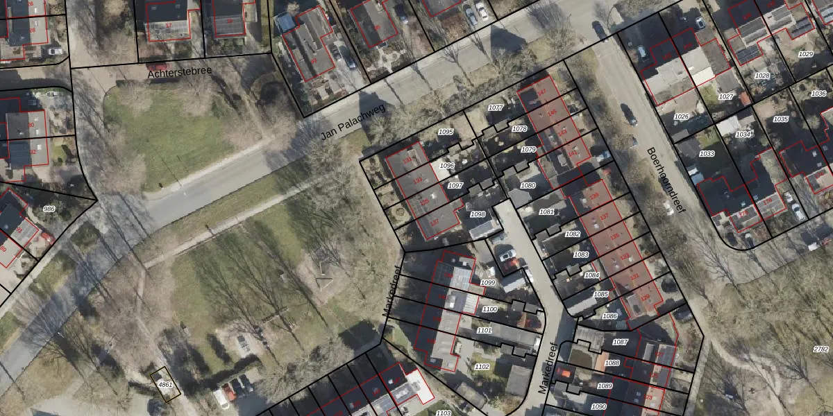 Gebruik de zoekbalk of klik op een perceel voor informatie over de adressen binnen dit perceel.