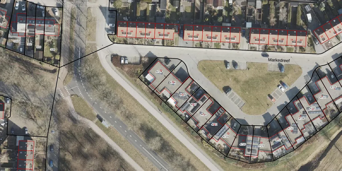 Het perceel waarop Markedreef 33 staat heeft een oppervlakte van 224 m². Dit is een middelgroot perceel. De perceeloppervlakte wordt geregistreerd door het Kadaster. Gedetailleerde informatie over de maten van dit perceel kunt u vinden in het rapport Kadastrale kaart met maatvoering van Markedreef 33.