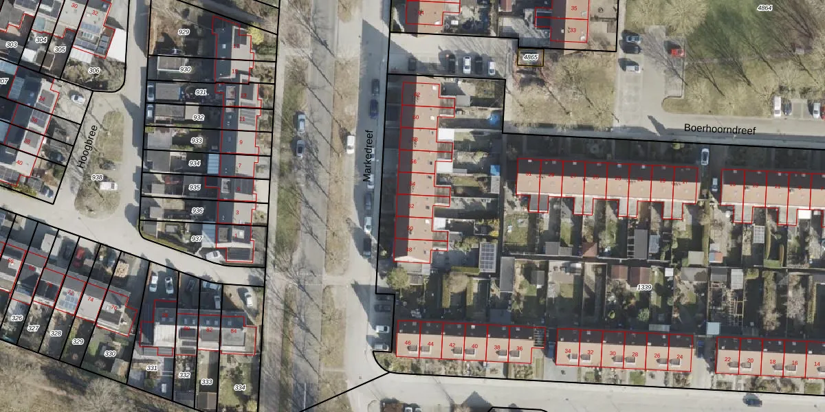Het perceel waarop Markedreef 52 staat heeft een oppervlakte van 8596 m². Dit is een zeer groot perceel. De perceeloppervlakte wordt geregistreerd door het Kadaster. Gedetailleerde informatie over de maten van dit perceel kunt u vinden in het rapport Kadastrale kaart met maatvoering van Markedreef 52.