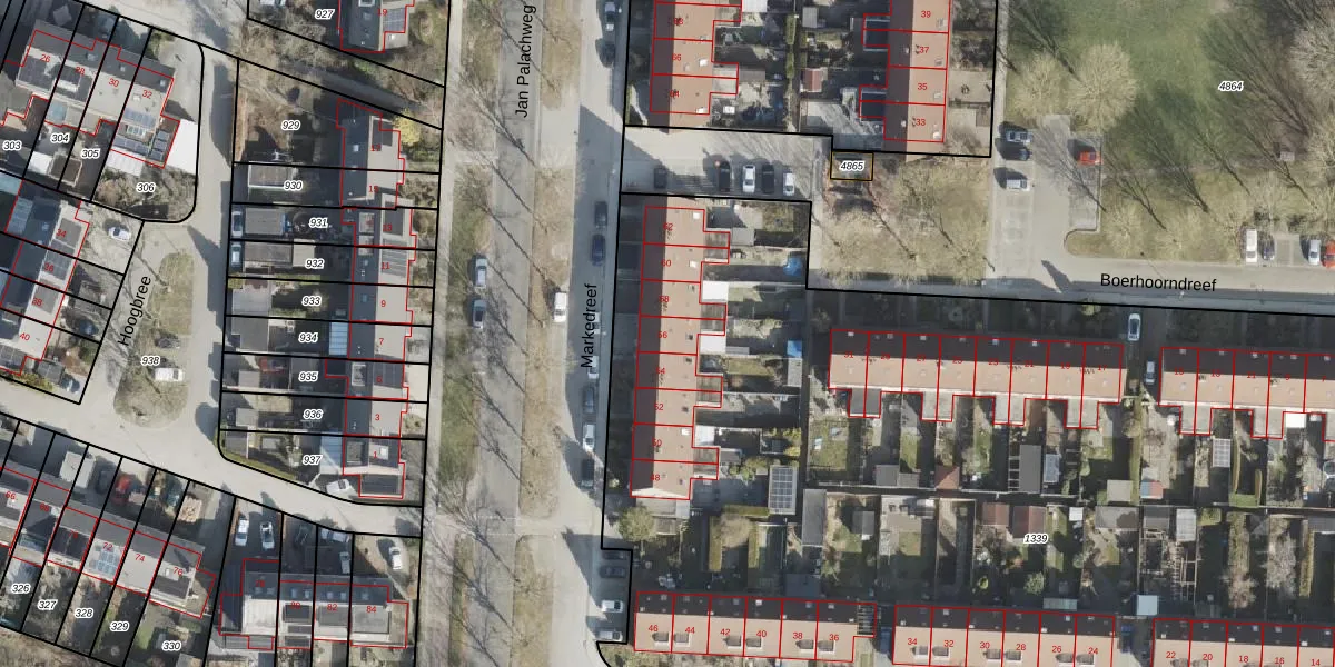 Het perceel waarop Markedreef 56 staat heeft een oppervlakte van 8596 m². Dit is een zeer groot perceel. De perceeloppervlakte wordt geregistreerd door het Kadaster. Gedetailleerde informatie over de maten van dit perceel kunt u vinden in het rapport Kadastrale kaart met maatvoering van Markedreef 56.