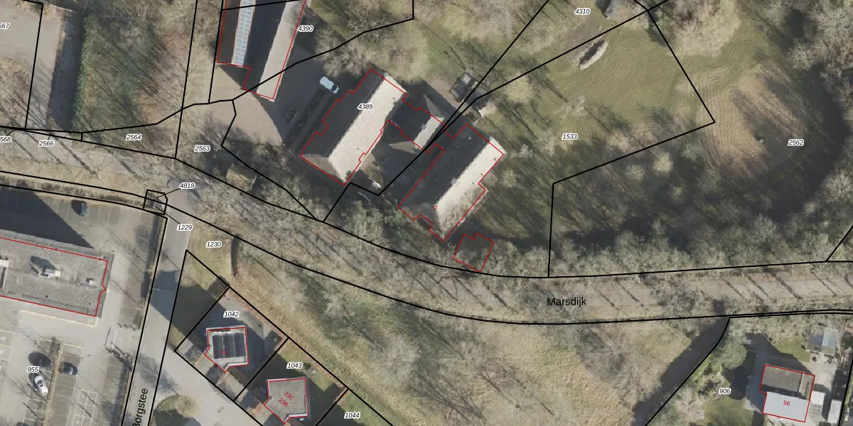 Het perceel waarop Marsdijk 5 staat heeft een oppervlakte van 2465 m². Dit is een zeer groot perceel. De perceeloppervlakte wordt geregistreerd door het Kadaster. Gedetailleerde informatie over de maten van dit perceel kunt u vinden in het rapport Kadastrale kaart met maatvoering van Marsdijk 5.