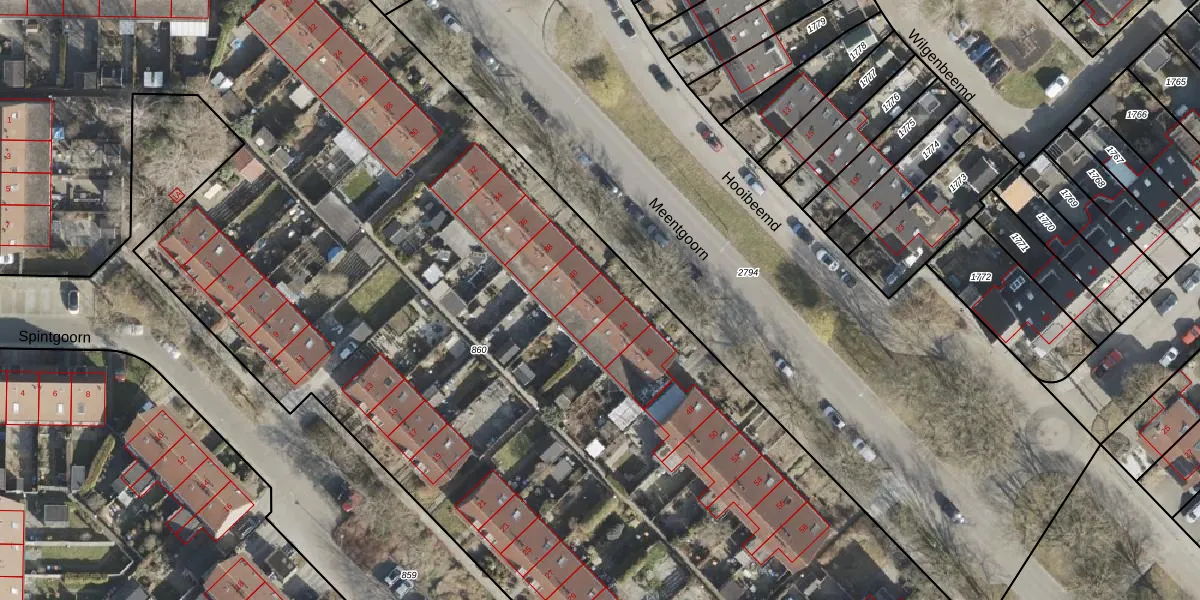 Het perceel waarop Meentgoorn 42 staat heeft een oppervlakte van 1,0 ha. Dit is een zeer groot perceel. De perceeloppervlakte wordt geregistreerd door het Kadaster. Gedetailleerde informatie over de maten van dit perceel kunt u vinden in het rapport Kadastrale kaart met maatvoering van Meentgoorn 42.