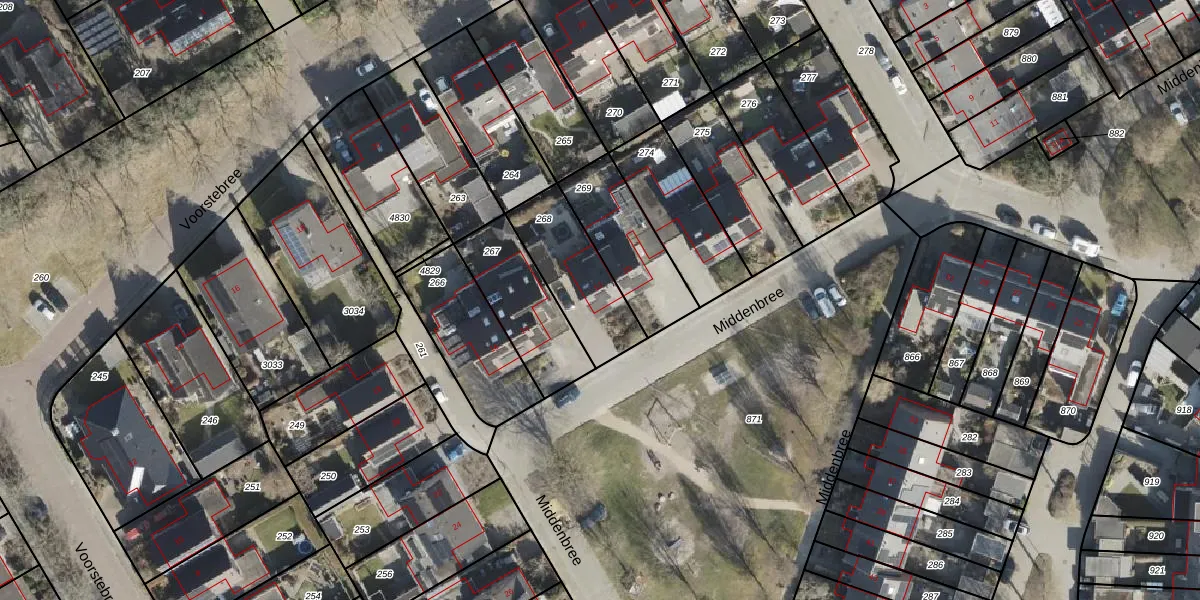 Het perceel waarop Middenbree 12 staat heeft een oppervlakte van 300 m². Dit is een groot perceel. De perceeloppervlakte wordt geregistreerd door het Kadaster. Gedetailleerde informatie over de maten van dit perceel kunt u vinden in het rapport Kadastrale kaart met maatvoering van Middenbree 12.