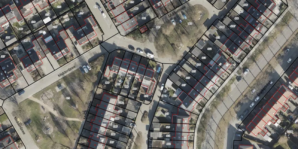 Het perceel waarop Middenbree 23 staat heeft een oppervlakte van 300 m². Dit is een groot perceel. De perceeloppervlakte wordt geregistreerd door het Kadaster. Gedetailleerde informatie over de maten van dit perceel kunt u vinden in het rapport Kadastrale kaart met maatvoering van Middenbree 23.