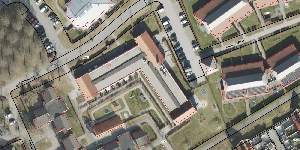Het perceel waarop Middenweg 16-K staat heeft een oppervlakte van 1,3 ha. Dit is een zeer groot perceel. De perceeloppervlakte wordt geregistreerd door het Kadaster. Gedetailleerde informatie over de maten van dit perceel kunt u vinden in het rapport Kadastrale kaart met maatvoering van Middenweg 16-K.