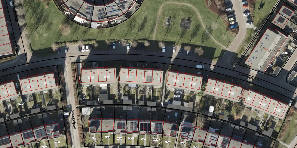 Het perceel waarop Moerbeistraat 72 staat heeft een oppervlakte van 4230 m². Dit is een zeer groot perceel. De perceeloppervlakte wordt geregistreerd door het Kadaster. Gedetailleerde informatie over de maten van dit perceel kunt u vinden in het rapport Kadastrale kaart met maatvoering van Moerbeistraat 72.