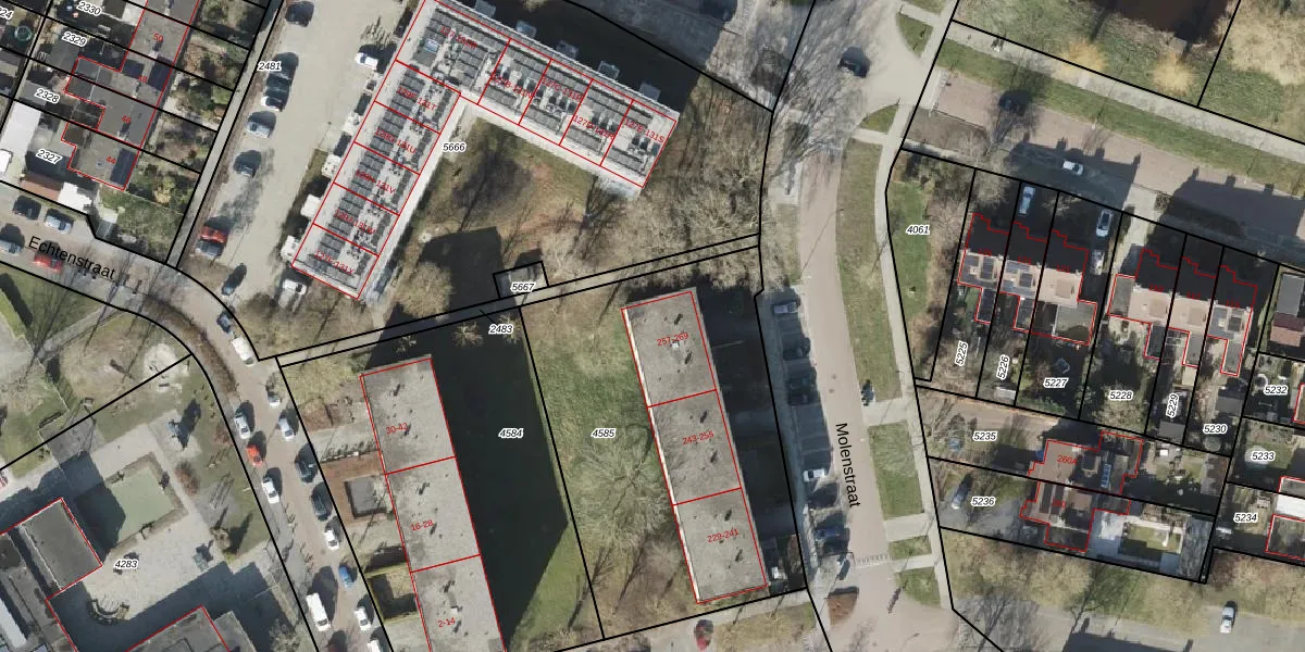 Het perceel waarop Molenstraat 263 staat heeft een oppervlakte van 1801 m². Dit is een zeer groot perceel. De perceeloppervlakte wordt geregistreerd door het Kadaster. Gedetailleerde informatie over de maten van dit perceel kunt u vinden in het rapport Kadastrale kaart met maatvoering van Molenstraat 263.