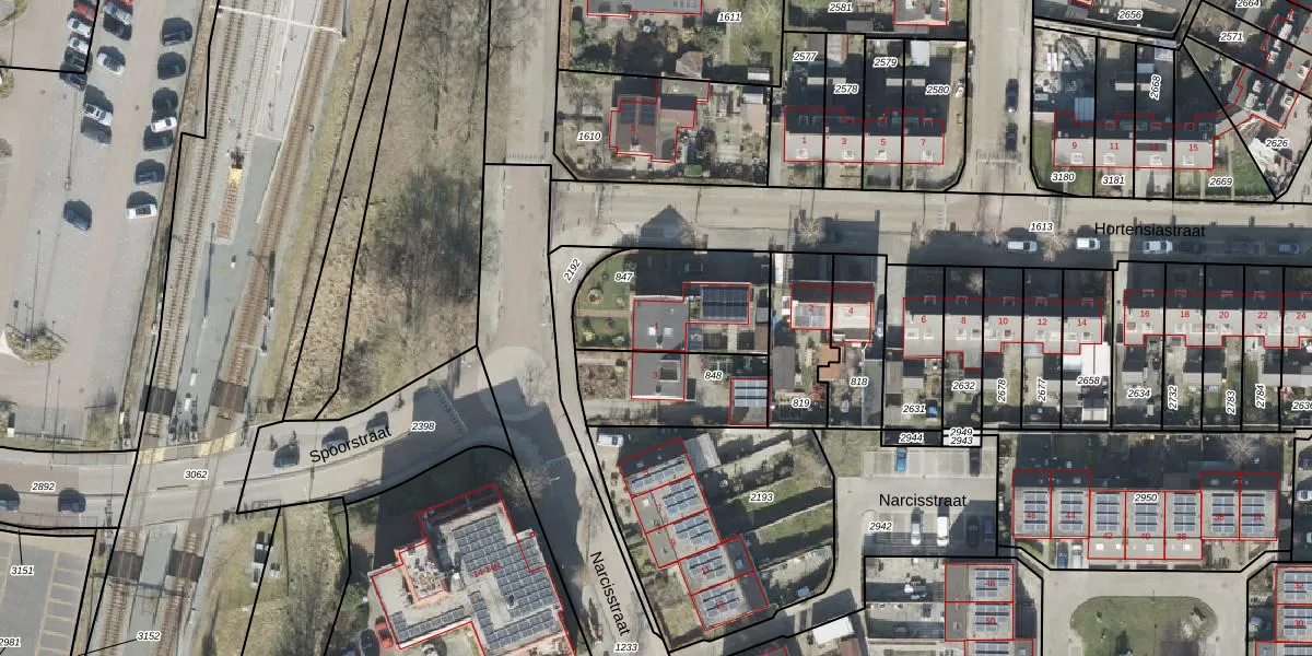 Het perceel waarop Narcisstraat 1 staat heeft een oppervlakte van 445 m². Dit is een groot perceel. De perceeloppervlakte wordt geregistreerd door het Kadaster. Gedetailleerde informatie over de maten van dit perceel kunt u vinden in het rapport Kadastrale kaart met maatvoering van Narcisstraat 1.