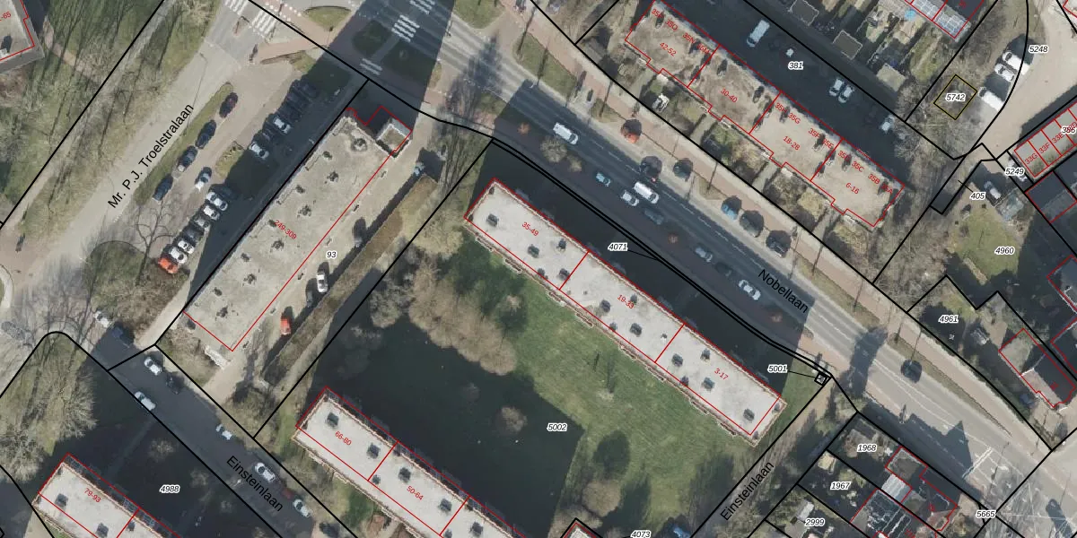 Het perceel waarop Nobellaan 41 staat heeft een oppervlakte van 5372 m². Dit is een zeer groot perceel. De perceeloppervlakte wordt geregistreerd door het Kadaster. Gedetailleerde informatie over de maten van dit perceel kunt u vinden in het rapport Kadastrale kaart met maatvoering van Nobellaan 41.