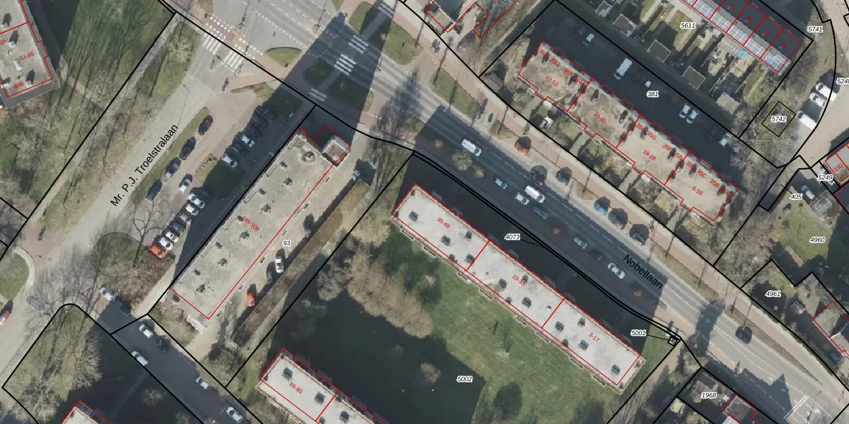 Het perceel waarop Nobellaan 45 staat heeft een oppervlakte van 5372 m². Dit is een zeer groot perceel. De perceeloppervlakte wordt geregistreerd door het Kadaster. Gedetailleerde informatie over de maten van dit perceel kunt u vinden in het rapport Kadastrale kaart met maatvoering van Nobellaan 45.