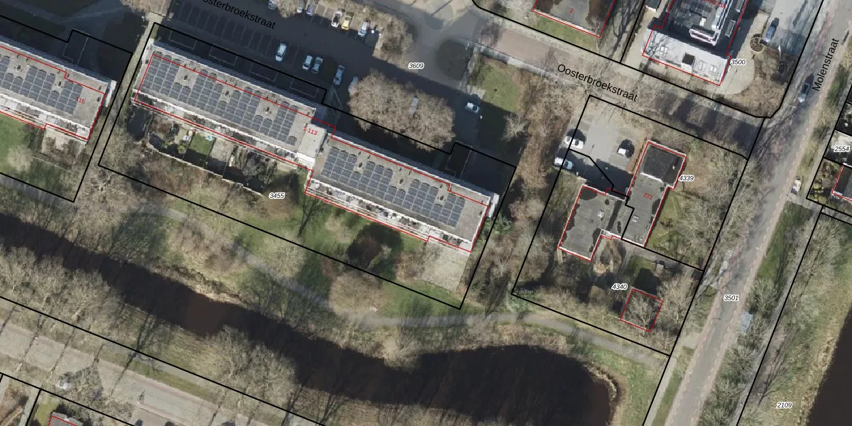 Het perceel waarop Oosterbroekstraat 61 staat heeft een oppervlakte van 3197 m². Dit is een zeer groot perceel. De perceeloppervlakte wordt geregistreerd door het Kadaster. Gedetailleerde informatie over de maten van dit perceel kunt u vinden in het rapport Kadastrale kaart met maatvoering van Oosterbroekstraat 61.