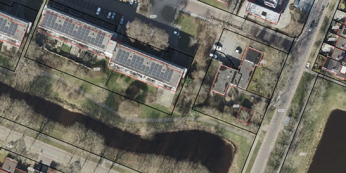 Het perceel waarop Oosterbroekstraat 97 staat heeft een oppervlakte van 3197 m². Dit is een zeer groot perceel. De perceeloppervlakte wordt geregistreerd door het Kadaster. Gedetailleerde informatie over de maten van dit perceel kunt u vinden in het rapport Kadastrale kaart met maatvoering van Oosterbroekstraat 97.