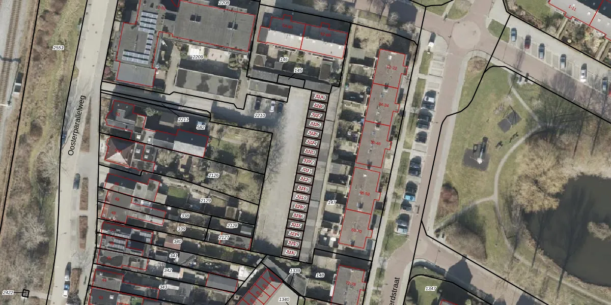 Het perceel waarop Oosterparallelweg 51-G staat heeft een oppervlakte van 18 m². Dit is een klein perceel. De perceeloppervlakte wordt geregistreerd door het Kadaster. Gedetailleerde informatie over de maten van dit perceel kunt u vinden in het rapport Kadastrale kaart met maatvoering van Oosterparallelweg 51-G.