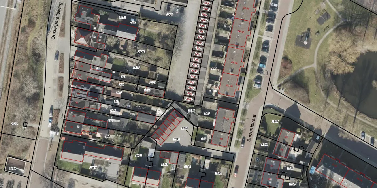 Gebruik de zoekbalk of klik op een perceel voor informatie over de adressen binnen dit perceel.
