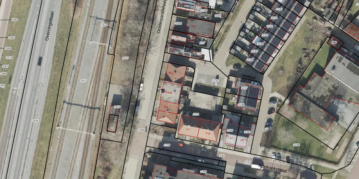 Het perceel waarop Oosterparallelweg 60-B staat heeft een oppervlakte van 1240 m². Dit is een zeer groot perceel. De perceeloppervlakte wordt geregistreerd door het Kadaster. Gedetailleerde informatie over de maten van dit perceel kunt u vinden in het rapport Kadastrale kaart met maatvoering van Oosterparallelweg 60-B.
