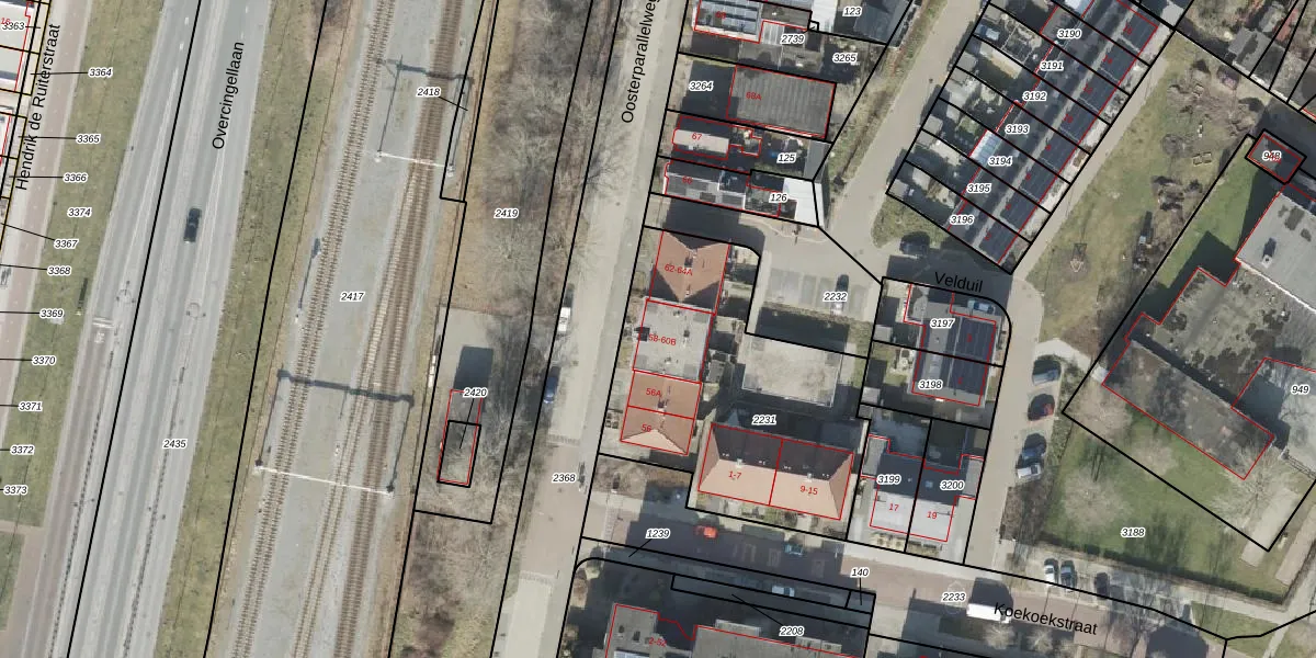 Het perceel waarop Oosterparallelweg 60 staat heeft een oppervlakte van 1240 m². Dit is een zeer groot perceel. De perceeloppervlakte wordt geregistreerd door het Kadaster. Gedetailleerde informatie over de maten van dit perceel kunt u vinden in het rapport Kadastrale kaart met maatvoering van Oosterparallelweg 60.