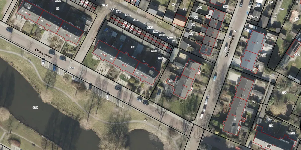 Het perceel waarop Oosterpark 107 staat heeft een oppervlakte van 1715 m². Dit is een zeer groot perceel. De perceeloppervlakte wordt geregistreerd door het Kadaster. Gedetailleerde informatie over de maten van dit perceel kunt u vinden in het rapport Kadastrale kaart met maatvoering van Oosterpark 107.