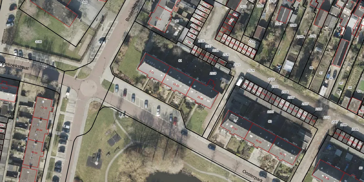 Het perceel waarop Oosterpark 19 staat heeft een oppervlakte van 2060 m². Dit is een zeer groot perceel. De perceeloppervlakte wordt geregistreerd door het Kadaster. Gedetailleerde informatie over de maten van dit perceel kunt u vinden in het rapport Kadastrale kaart met maatvoering van Oosterpark 19.