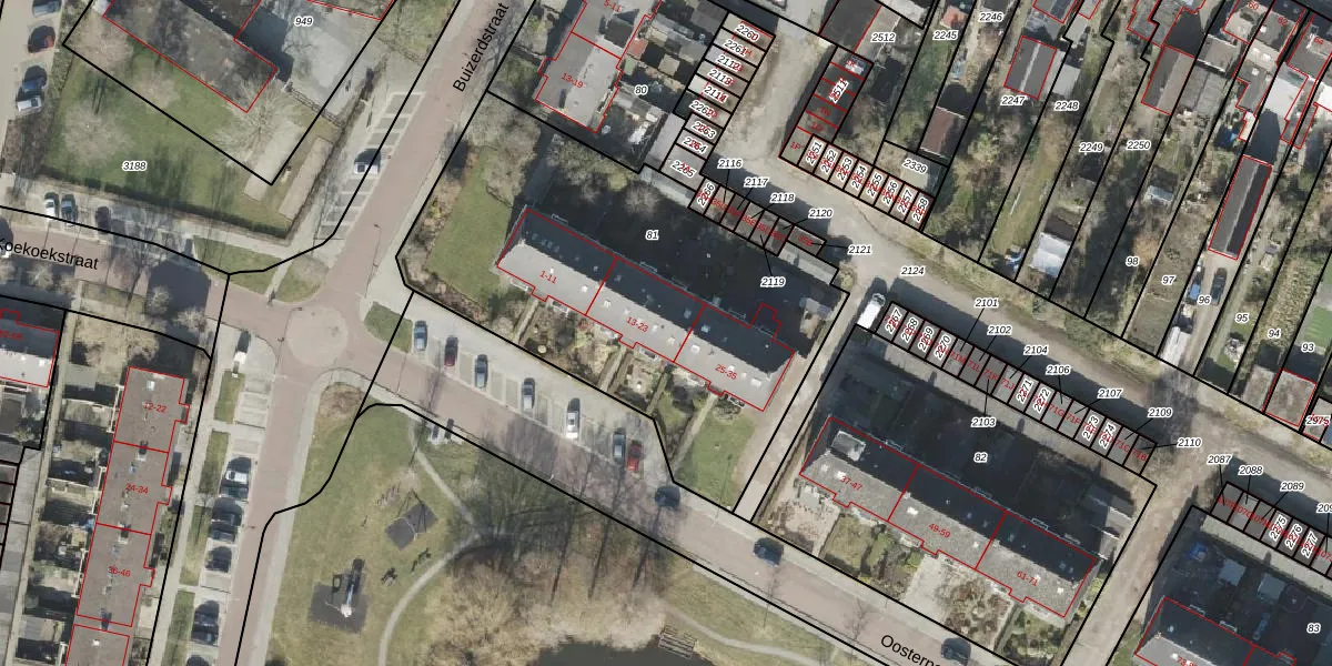 Het perceel waarop Oosterpark 21 staat heeft een oppervlakte van 2060 m². Dit is een zeer groot perceel. De perceeloppervlakte wordt geregistreerd door het Kadaster. Gedetailleerde informatie over de maten van dit perceel kunt u vinden in het rapport Kadastrale kaart met maatvoering van Oosterpark 21.