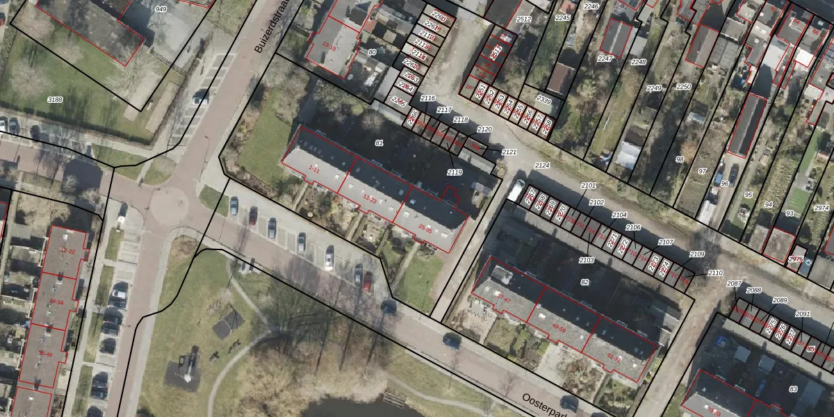 Het perceel waarop Oosterpark 29 staat heeft een oppervlakte van 2060 m². Dit is een zeer groot perceel. De perceeloppervlakte wordt geregistreerd door het Kadaster. Gedetailleerde informatie over de maten van dit perceel kunt u vinden in het rapport Kadastrale kaart met maatvoering van Oosterpark 29.