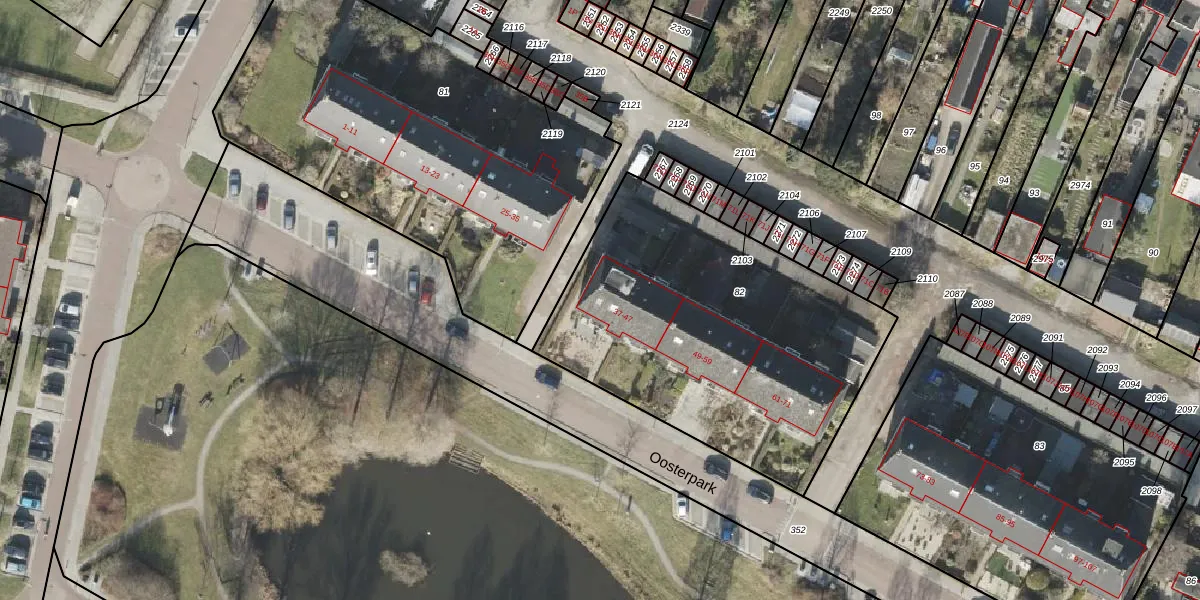 Het perceel waarop Oosterpark 39 staat heeft een oppervlakte van 1735 m². Dit is een zeer groot perceel. De perceeloppervlakte wordt geregistreerd door het Kadaster. Gedetailleerde informatie over de maten van dit perceel kunt u vinden in het rapport Kadastrale kaart met maatvoering van Oosterpark 39.