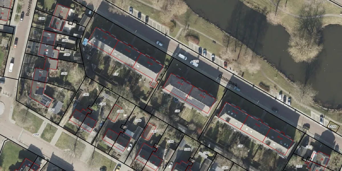 Het perceel waarop Oosterpark 42 staat heeft een oppervlakte van 1280 m². Dit is een zeer groot perceel. De perceeloppervlakte wordt geregistreerd door het Kadaster. Gedetailleerde informatie over de maten van dit perceel kunt u vinden in het rapport Kadastrale kaart met maatvoering van Oosterpark 42.