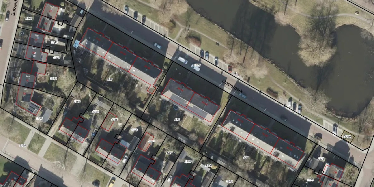 Het perceel waarop Oosterpark 44 staat heeft een oppervlakte van 1280 m². Dit is een zeer groot perceel. De perceeloppervlakte wordt geregistreerd door het Kadaster. Gedetailleerde informatie over de maten van dit perceel kunt u vinden in het rapport Kadastrale kaart met maatvoering van Oosterpark 44.
