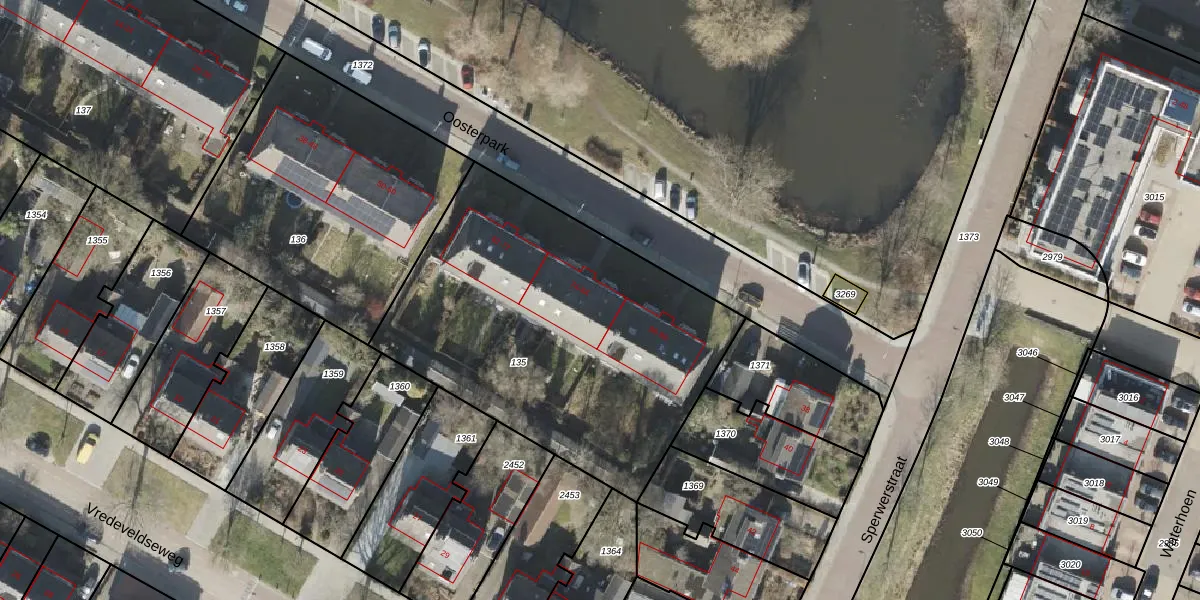Het perceel waarop Oosterpark 80 staat heeft een oppervlakte van 1845 m². Dit is een zeer groot perceel. De perceeloppervlakte wordt geregistreerd door het Kadaster. Gedetailleerde informatie over de maten van dit perceel kunt u vinden in het rapport Kadastrale kaart met maatvoering van Oosterpark 80.