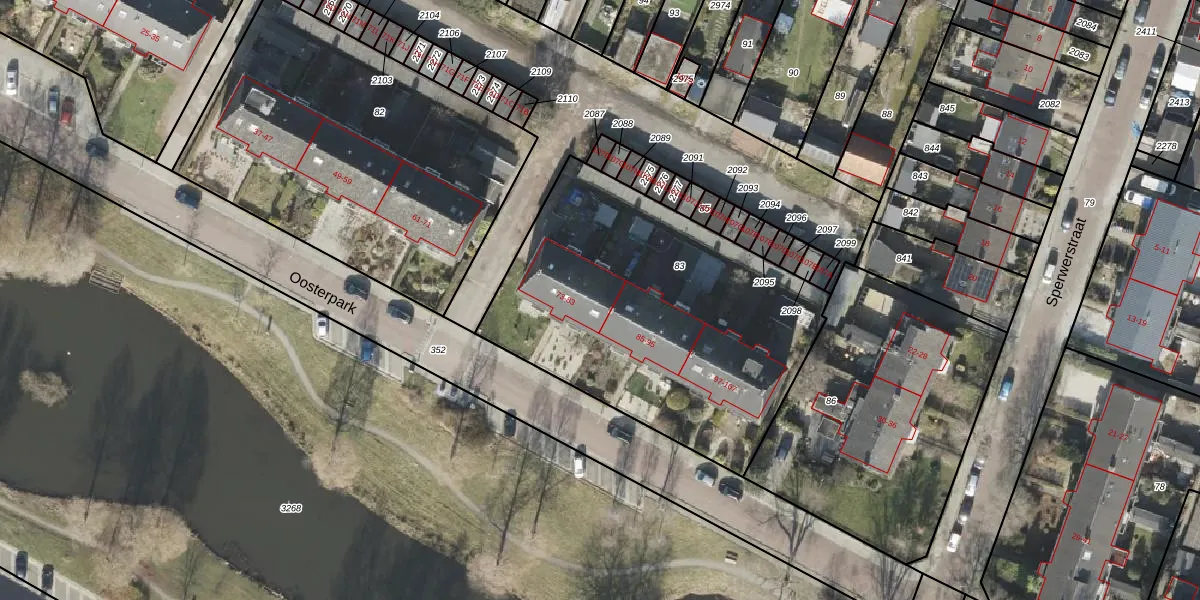 Het perceel waarop Oosterpark 83 staat heeft een oppervlakte van 1715 m². Dit is een zeer groot perceel. De perceeloppervlakte wordt geregistreerd door het Kadaster. Gedetailleerde informatie over de maten van dit perceel kunt u vinden in het rapport Kadastrale kaart met maatvoering van Oosterpark 83.