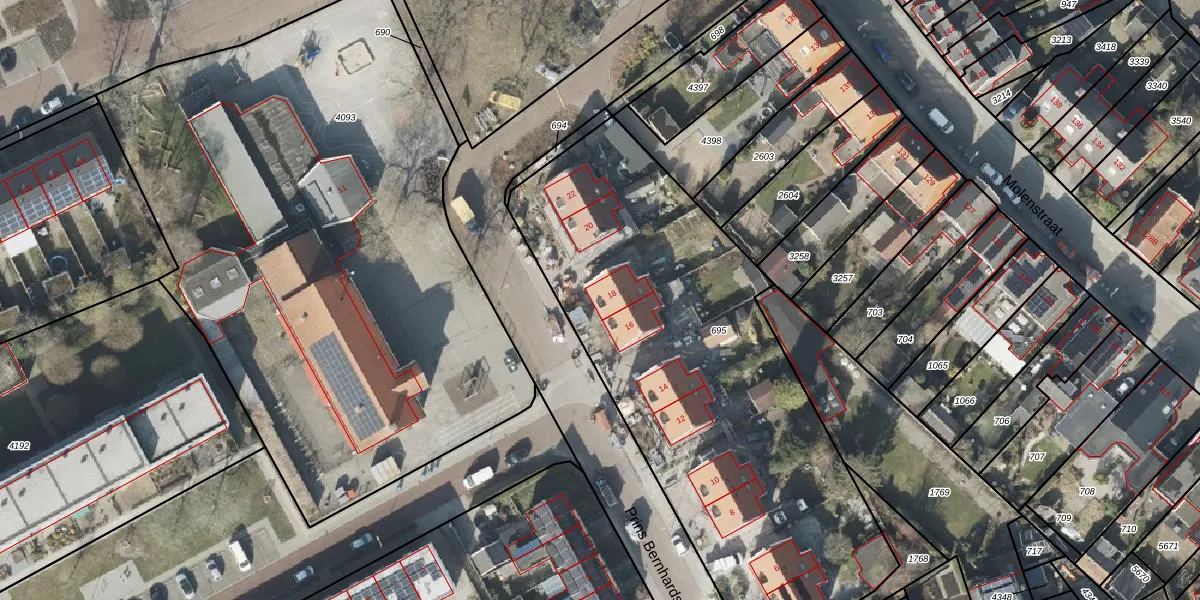 Het perceel waarop Prins Bernhardstraat 18 staat heeft een oppervlakte van 2563 m². Dit is een zeer groot perceel. De perceeloppervlakte wordt geregistreerd door het Kadaster. Gedetailleerde informatie over de maten van dit perceel kunt u vinden in het rapport Kadastrale kaart met maatvoering van Prins Bernhardstraat 18.