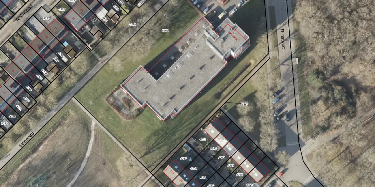 Het perceel waarop Rijnstraat 39-14 staat heeft een oppervlakte van 6118 m². Dit is een zeer groot perceel. De perceeloppervlakte wordt geregistreerd door het Kadaster. Gedetailleerde informatie over de maten van dit perceel kunt u vinden in het rapport Kadastrale kaart met maatvoering van Rijnstraat 39-14.