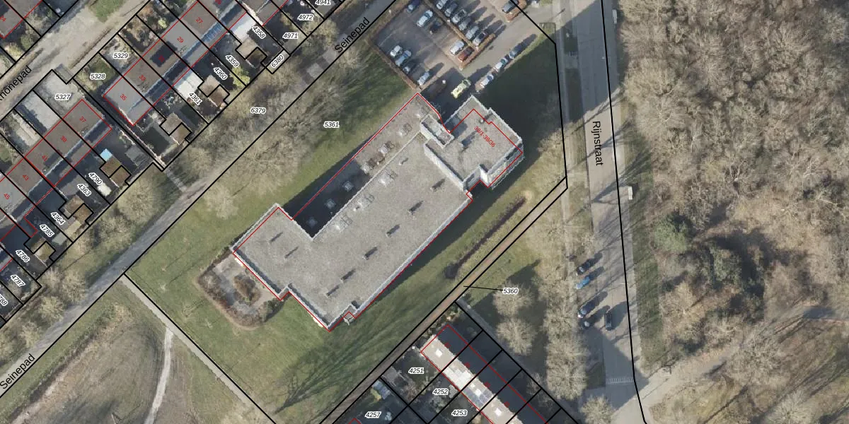 Het perceel waarop Rijnstraat 39-22 staat heeft een oppervlakte van 6118 m². Dit is een zeer groot perceel. De perceeloppervlakte wordt geregistreerd door het Kadaster. Gedetailleerde informatie over de maten van dit perceel kunt u vinden in het rapport Kadastrale kaart met maatvoering van Rijnstraat 39-22.