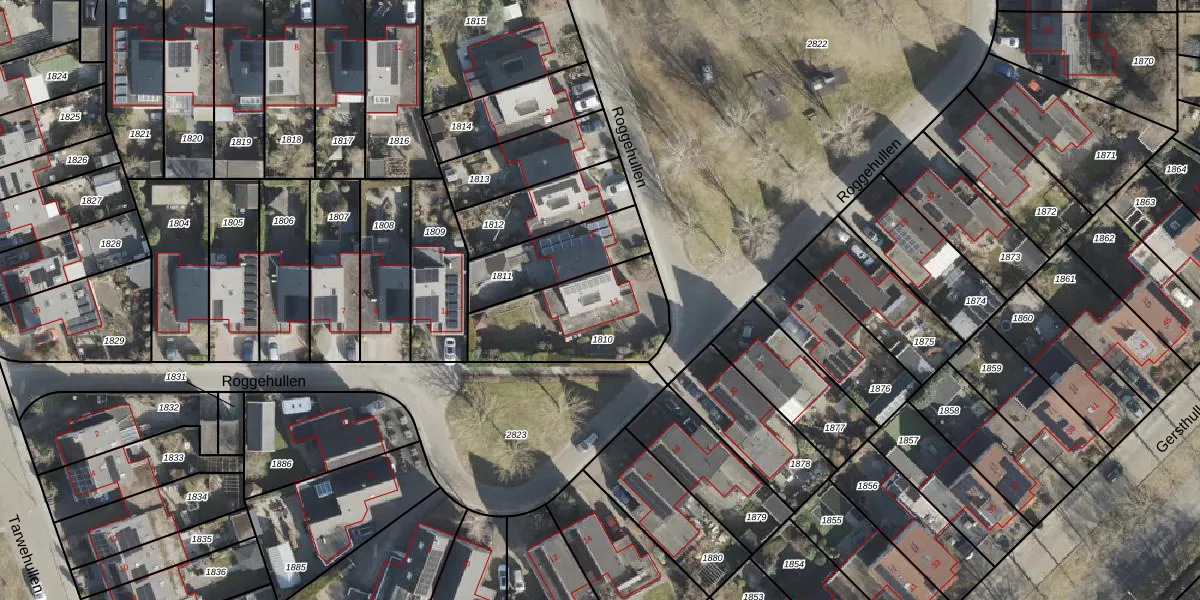Het perceel waarop Roggehullen 13 staat heeft een oppervlakte van 436 m². Dit is een groot perceel. De perceeloppervlakte wordt geregistreerd door het Kadaster. Gedetailleerde informatie over de maten van dit perceel kunt u vinden in het rapport Kadastrale kaart met maatvoering van Roggehullen 13.