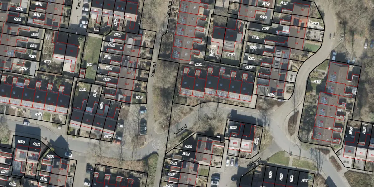 Het perceel waarop Salland 104 staat heeft een oppervlakte van 1810 m². Dit is een zeer groot perceel. De perceeloppervlakte wordt geregistreerd door het Kadaster. Gedetailleerde informatie over de maten van dit perceel kunt u vinden in het rapport Kadastrale kaart met maatvoering van Salland 104.