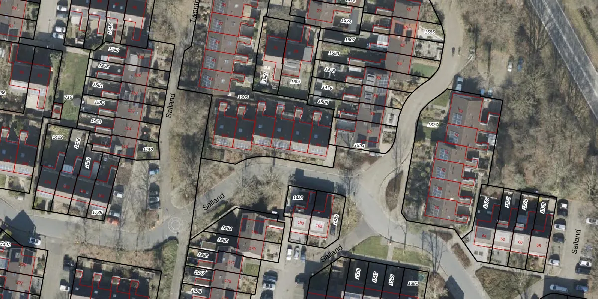 Het perceel waarop Salland 96 staat heeft een oppervlakte van 1810 m². Dit is een zeer groot perceel. De perceeloppervlakte wordt geregistreerd door het Kadaster. Gedetailleerde informatie over de maten van dit perceel kunt u vinden in het rapport Kadastrale kaart met maatvoering van Salland 96.
