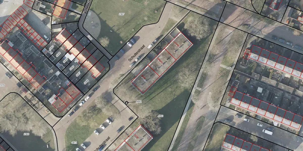Het perceel waarop Schultestraat 92 staat heeft een oppervlakte van 4736 m². Dit is een zeer groot perceel. De perceeloppervlakte wordt geregistreerd door het Kadaster. Gedetailleerde informatie over de maten van dit perceel kunt u vinden in het rapport Kadastrale kaart met maatvoering van Schultestraat 92.