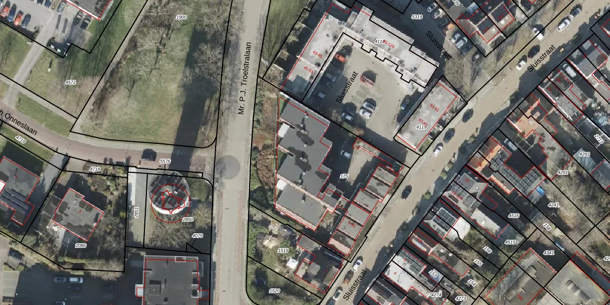 Het perceel waarop Sluisstraat 41 staat heeft een oppervlakte van 1800 m². Dit is een zeer groot perceel. De perceeloppervlakte wordt geregistreerd door het Kadaster. Gedetailleerde informatie over de maten van dit perceel kunt u vinden in het rapport Kadastrale kaart met maatvoering van Sluisstraat 41.
