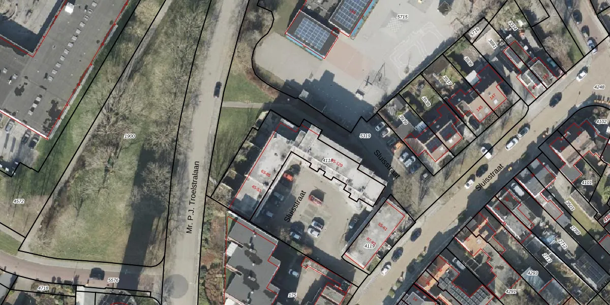 Het perceel waarop Sluisstraat 77 staat heeft een oppervlakte van 800 m². Dit is een groot perceel. De perceeloppervlakte wordt geregistreerd door het Kadaster. Gedetailleerde informatie over de maten van dit perceel kunt u vinden in het rapport Kadastrale kaart met maatvoering van Sluisstraat 77.
