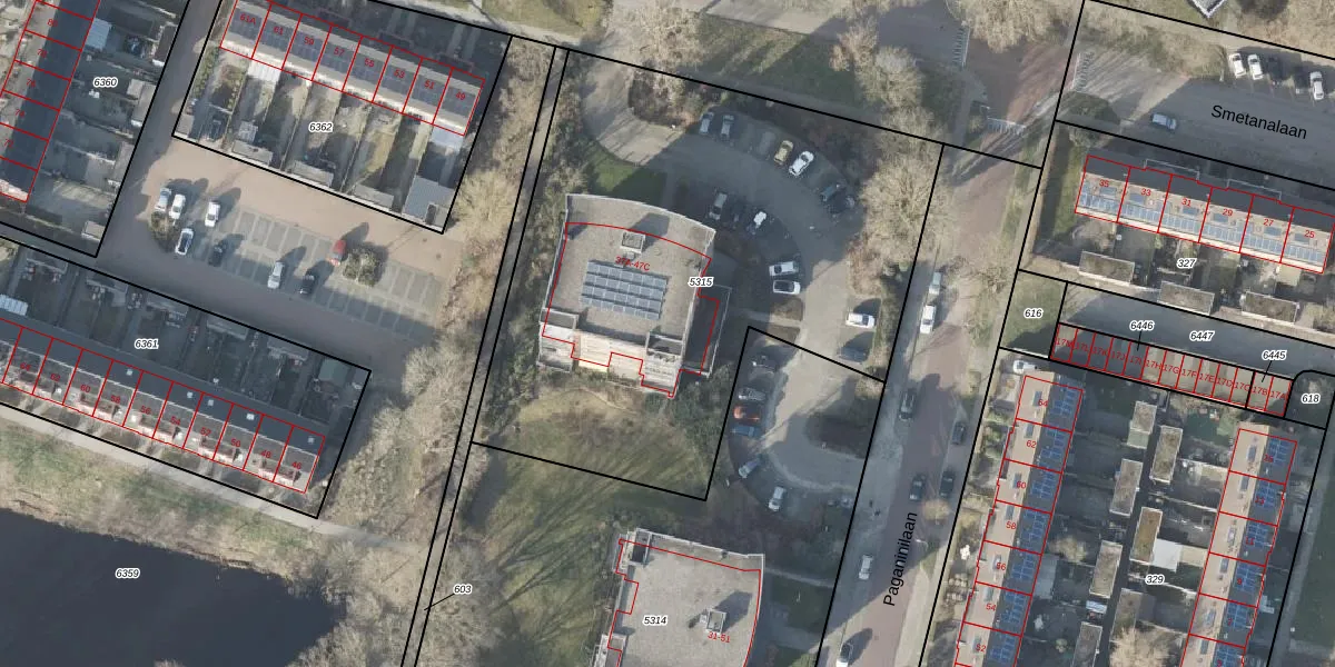 Het perceel waarop Smetanalaan 47-A staat heeft een oppervlakte van 2977 m². Dit is een zeer groot perceel. De perceeloppervlakte wordt geregistreerd door het Kadaster. Gedetailleerde informatie over de maten van dit perceel kunt u vinden in het rapport Kadastrale kaart met maatvoering van Smetanalaan 47-A.